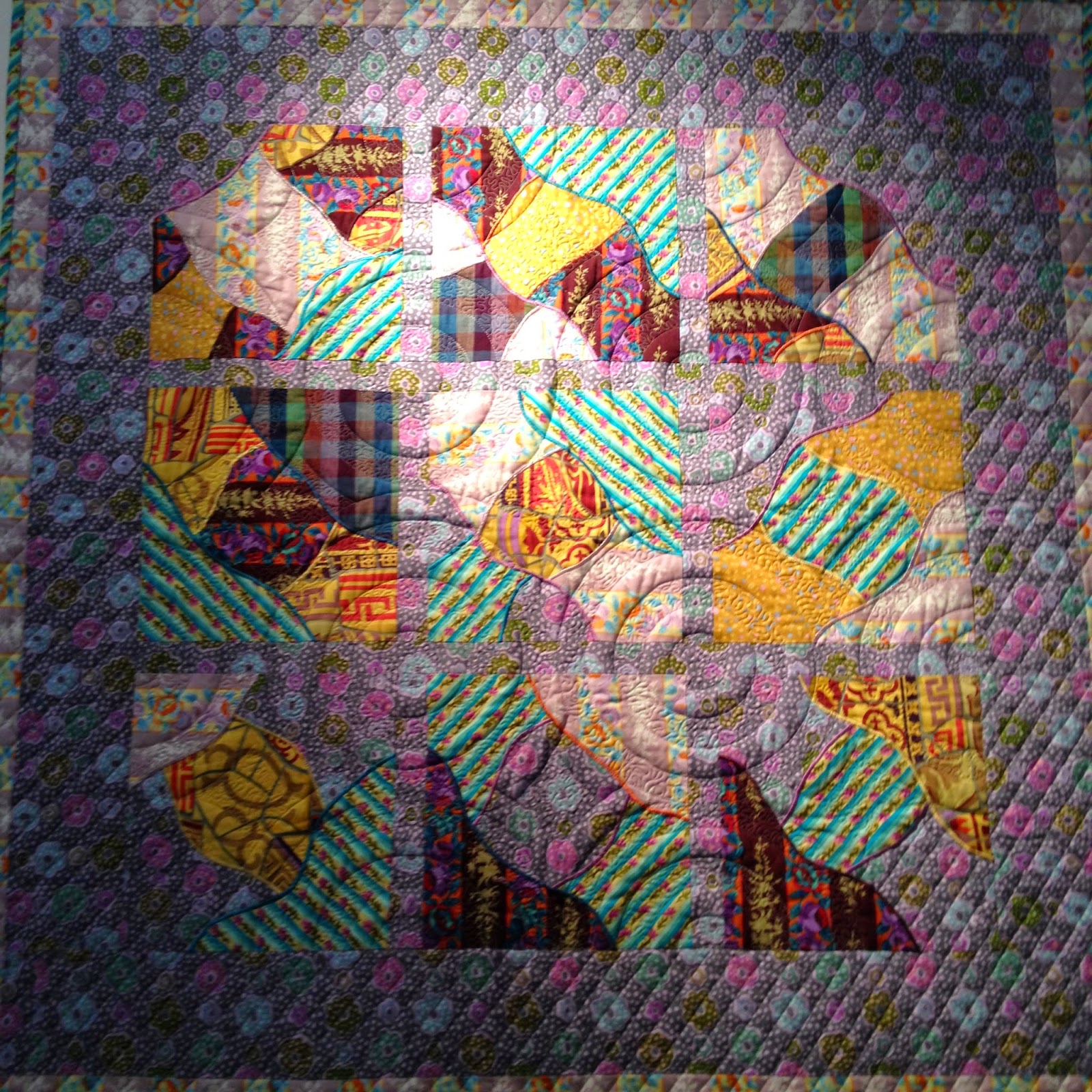En fait j'avais prévu d'en finir deux, je les ai mis ensemble sur la machine et je les ai matelassés. Le problème a été de trouver un tissu qui s'harmonise avec les tissus utilisés dans chacun des ouvrages (sans sortir de chez moi !). Pour le petit j'ai eu la chance de trouver dans mon tiroirs de bandes le reste d'un précédent ouvrage, mais pour l'autre j'ai envie de finir par un biais vert et je ne suis pas très riche en vert sauf dans les unis mais aucun ne s'accorde avec le top ! Moralité en 2015 je vais encore (être obligée d') acheter du tissu!!!
